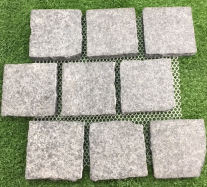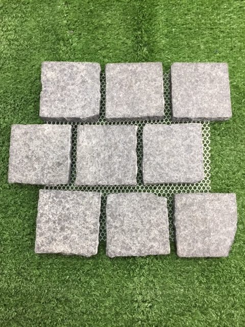 G684 Flamed Cobble – Is also referred to as Black Pearl. This is a durable stone often used for external areas demanding a hard wearing surface. It is very popular in commercial applications as well as driveways etc. This particular cobble is a flamed finish with split sides in 100x100x20mm. This cobble is stocked in a stretcher bond pattern.